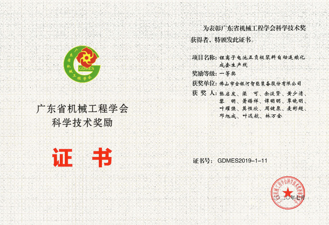 2020年7月,凯发k8一触即发项目“锂离子电池正负极浆料自动连续化成套生产线”被广东省机械工程学会授予“广东省机械工程学会科学技术一等奖”。 该项目开创了连续化大批量生产锂电池浆料的成套技术、工艺和装备,经科技成果鉴定,该项目总体技术水平处于国际先进水平,部分技术达到国际领先水平。本次获奖是对凯发k8一触即发自主创新技术的高度认可和极大鼓舞,凯发k8一触即发将持续不断提高自主创新能力,提供优质领先产品,致力提高客户服务水平、推动所从事行业的持续升级!